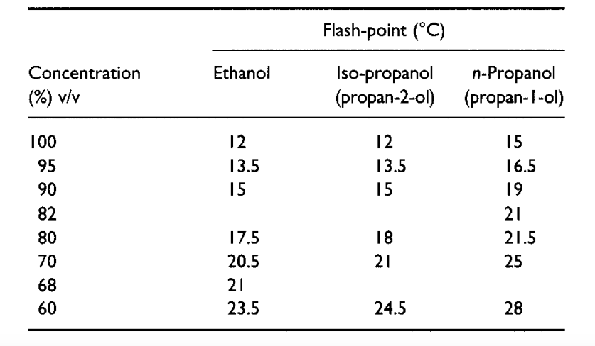 In order to get an insight of the potential fire risk that flammable liquids and low-melting substances can pose, we need to look at the flashpoint temperature of the substance in question. This flashpoint is defined as “the minimum temperature at which a flammable substance can be ignited by an open flame”5. In Table 1, we can see the flashpoints of ethanol and propanols. As we can appreciate, the flashpoint is dependent of the active substance’s concentration: the higher the concentration, the lower the flashpoint.