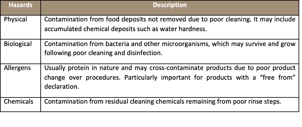 Cleaning and disinfection are critical within the food and beverage industries. This is essential in order to comply with legal and technical standards and ensure food hazards (Table 1) are controlled.