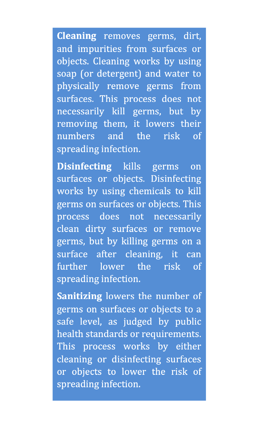 Many schools, and other facilities, use sanitizing and disinfecting products, which are also sometimes used as a general-purpose cleaner. Sanitizers are used to reduce, but not necessarily eliminate, microorganisms from the inanimate environment to levels considered safe as determined by public health codes or regulations.
